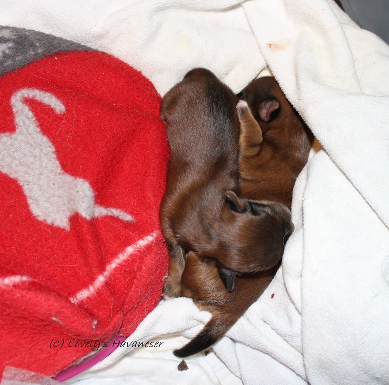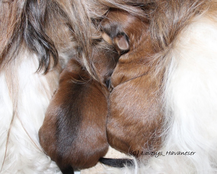 Hatty ist jedenfalls glücklich und verwöhnt ihre beiden Welpen und sorgt dafür, dass sie warm liegen und auch trinken können. Sie macht das wirklich super gut.